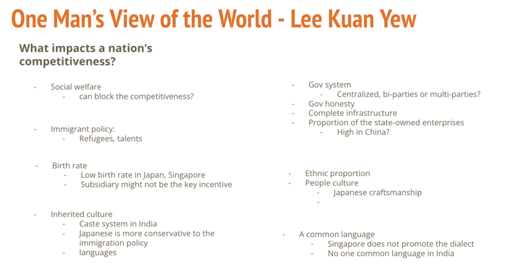 Lee is the founder of Singapore, and the way he observes the world tells us what makes a country thrive and become more competitive. Several key factors I learn from this book are summarized below: